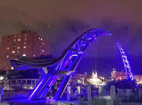 Cantilevered 80’ feet above the water, a graceful 300’ foot arc will span the Big Sioux River in downtown Sioux Falls. Firmly anchored on both banks, the stainless steel arc gradually tapers and has a 15’ synapse between the tips.